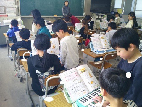 音楽では,「こぎつね」の曲を鍵盤ハーモニカで演奏していました。指使いやタンギングなどが正しくできているか,ペアで交代しながら確認し合っていました。