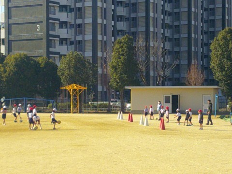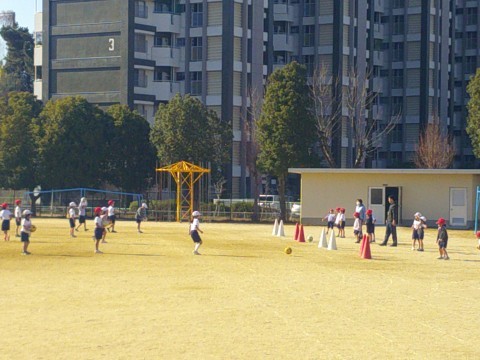 体育では,運動場でボール運動をしていました。ひなたでは暖かさを感じられるぐらいになり,元気にコーンの隙間で作ったゴールめがけてシュートしていました。