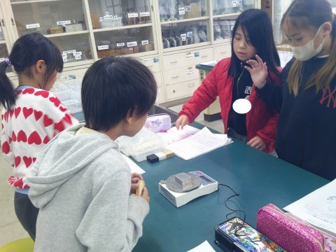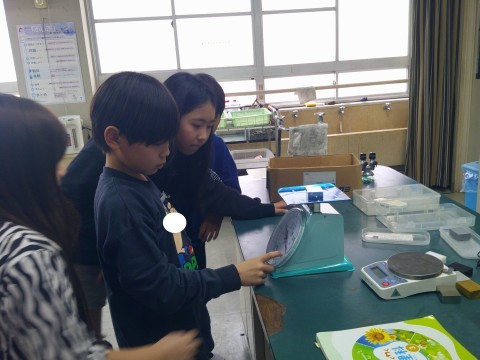 理科では,理科室で実験をしていました。同じ体積でも,ものの種類が違うと重さは違うのか,はかりを使って確かめていました。