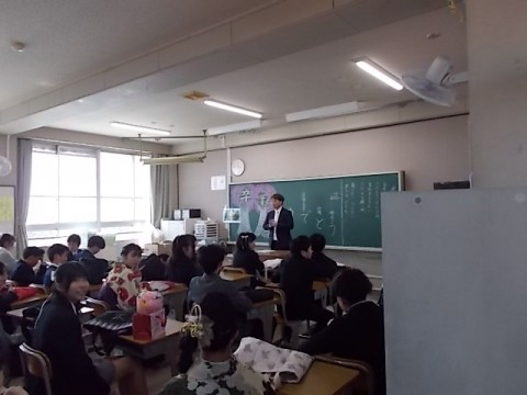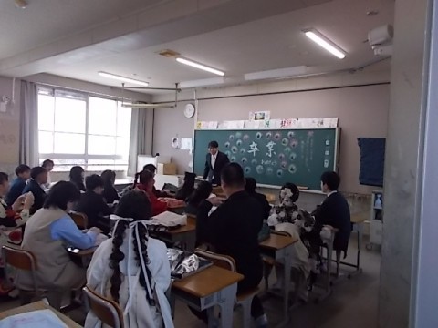 式場を出た後,慣れ親しんだ教室へ。先生やクラスの友達と最後のひと時を過ごしています。