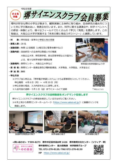 『堺サイエンスクラブ』募集案内 6年生対象