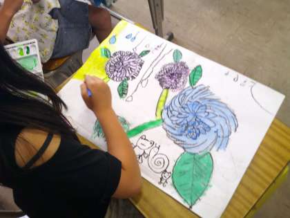 図工で描いていたアジサイの絵もだいぶできてきました。クレパスで描いた下絵の上から、水彩絵の具で塗っていきました。