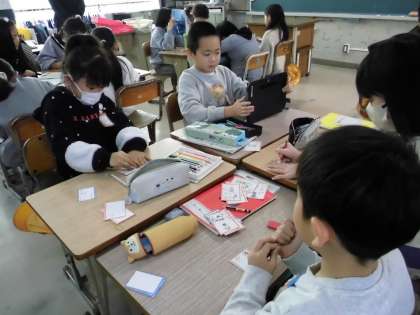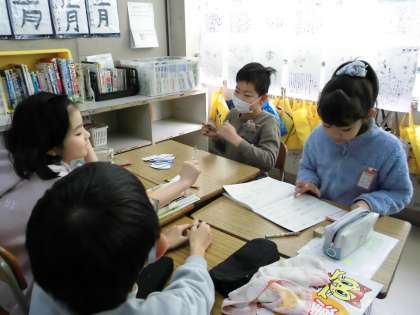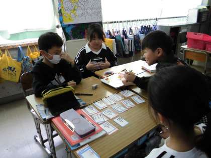 漢字の音読みと訓読みを使ったリズムのよい歌を考え、かるたのような札に読み札と取り札を作っていました。