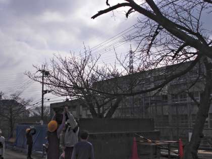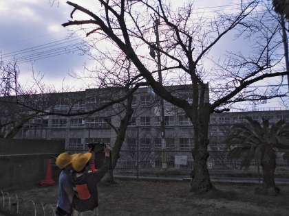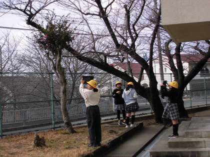 4年3組の子どもたちが、理科の学習で運動場の木々の様子をタブレットで撮影していました。