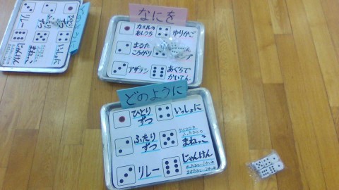 たんぽぽの朝の会(体育)は引き続きマット運動をしました。今日は、いろいろな場所に置かれているマットをグループで回りました。マットごとにサイコロを振り、何を・どのようにするかを決めて活動しました。サイコロでランダムで決まる楽しさもあり、マットごとに楽しく運動することができました。たんぽぽ以外の先生にも見に来てもらうことができ、嬉しそうに見てもらっている人もいました。さらに後片付けも協力してできました。