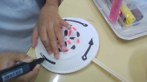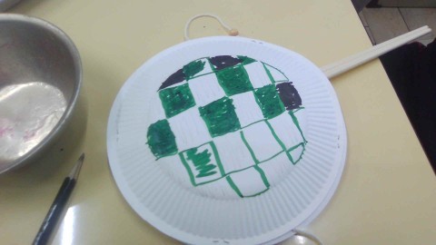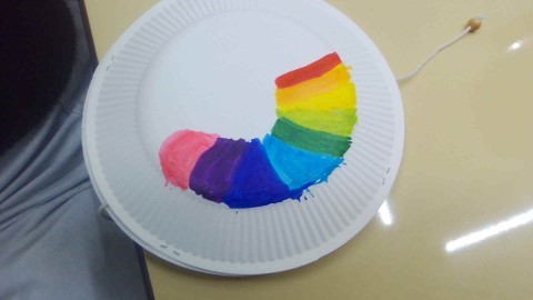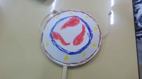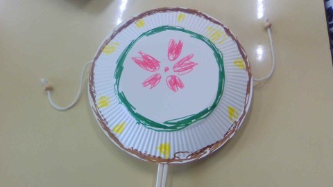 紙皿に模様やシルエットを描いたのですが、その子ごとに模様や色使いがさまざまで、個性があふれて、見ているだけでも楽しい時間になりました。完成した子はでんでん太鼓を回して遊んでいました。クルクル回るたびに表面の模様と裏面の模様が交互に見えて、その様子も綺麗でした。