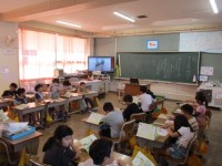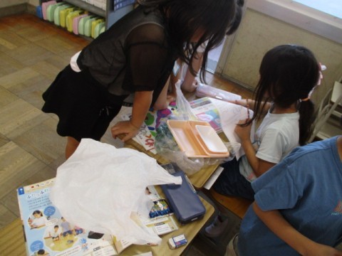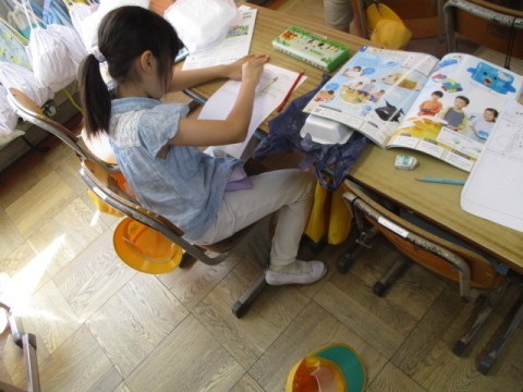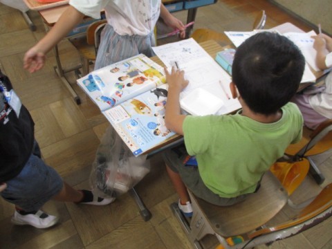 図工の時間の様子です。今日は、明日に作る作品の設計図をかきました。材料をみたり教科書のお手本をみたりしてかきました。また、友だちと相談しながら書き進めている児童もいました。