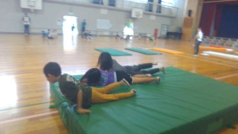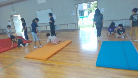 各コーナーではサイコロを振り出た目に合わせてグループの人とアイデアを出し合いながらマット運動をしました。