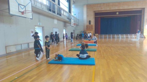 6種類のマット運動を練習した後,先週の同じようにグループの人と「協力して動きを楽しもう」をめあてに活動しました。