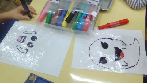 ストローから空気を送ると、プクーっと袋がふくらんで、最初に描いた可愛い絵の袋が現れ、みんな大喜びでした。