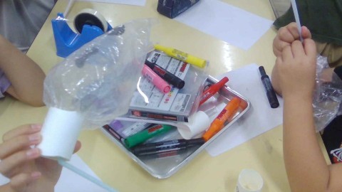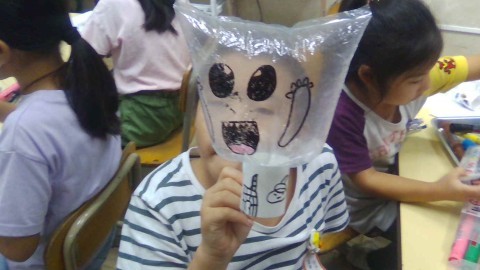 始めはビニール袋におばけの絵を描きました。舌をベ~と出したおばけや、ちょっと怖い顔のおばけなどがいて、どれも可愛らしいです。次は、絵を描いた袋をストローに貼りました。そのとき、めあてにあるように、空気がもれないようテープでしっかりと止めました。最後にペーパーの芯の内側にテープで固定しました。手先を使う細かい作業もありましたが、一生懸命テープで貼っていました。