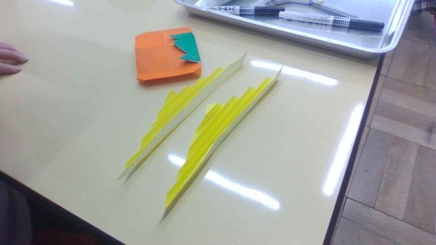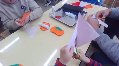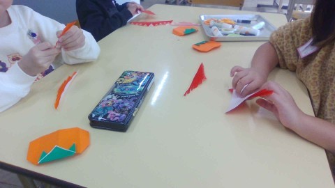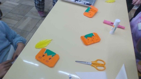 柿の実とヘタを折る際、全員が先生の話をよく聞き、スムーズに折り進めることができました。お顔もニッコリ可愛く描けました。落ち葉はじゃばら折りで作りました。「折って裏返して折って裏返して…」をくり返すことをしっかり理解して、上手に折ることができていました。2つ目は慣れて素早く折れる人もいました。オレンジの柿に赤と黄色の落ち葉がとっても綺麗です。