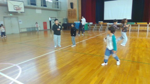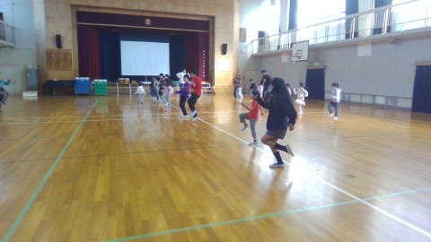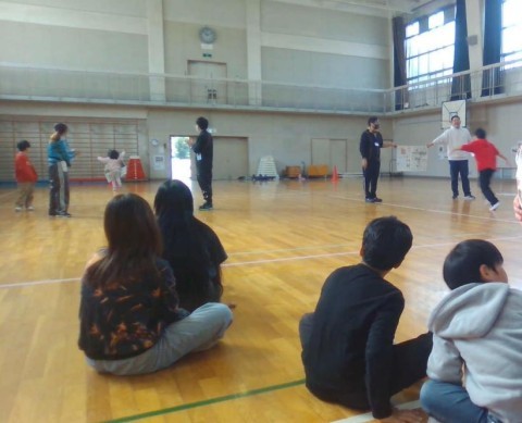 走る活動では、右と左の、言われた方向にターンして走ったり、タイとタコで「た、た、た……タコ!」など言われた方がもう一方を追いかけたり、よく聞いて走り始める練習をしました。