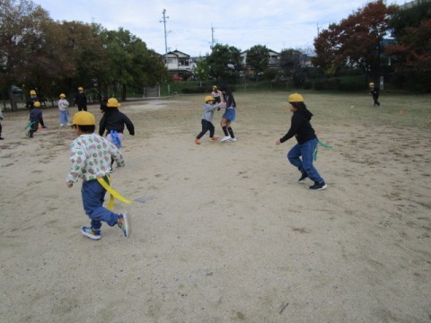 チームで協力してしっぽを取りに行きました。接戦でしたが青チームが勝ちました。結果を聞いた後はみんな拍手をしっかりしていました。