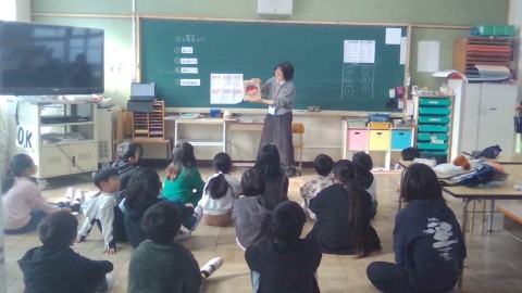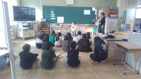 今日の読み聞かせは、1年生の教科書にも出てくる『おむすびころりん』でした。その後の絵本クイズ