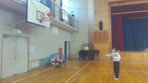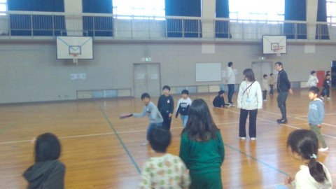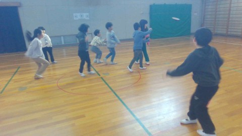 最後に手裏剣(フリスビー)を使った中当てをしました。途中からは手裏剣が2つに増え、中に残っている子はいろんな方向を見ながら一生懸命逃げました。