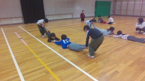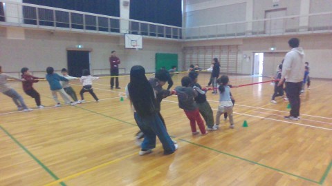 ウォーミングアップとして、なわを下に置いて、またぐように前後や左右にジャンプをしたり、片手でなわを持ってぐるぐる回したりしました。その後、1分間跳び続ける時間をとると、どんどん跳んでいました。なわとびの次は、つな引きをしました。1回戦は自由に、2回戦は並び順を考えてしました。1回戦と2回戦で勝ち負けが変わり、4チームとも1勝できました。
