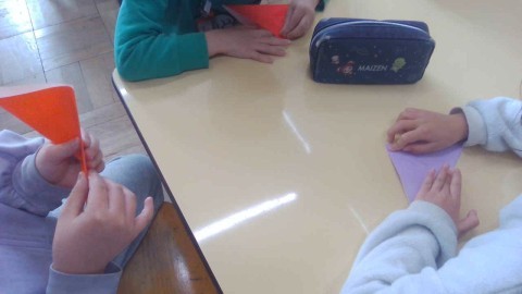 カラータッチゲームをした後に好きな色を使って花の折り紙を作りました。