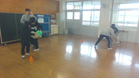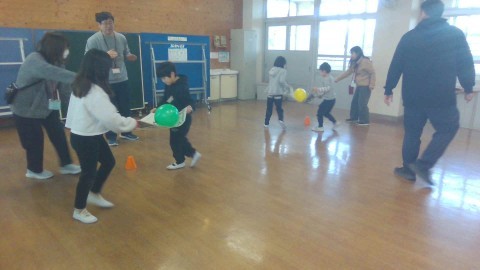 次は風船運びリレーをしました。新聞紙に乗せた風船をペアで運びました。前ばかり見ていたり、スピードが速かったりすると風船がふわふわと落ちてしまうので、ペアでうまく協力して運びました。