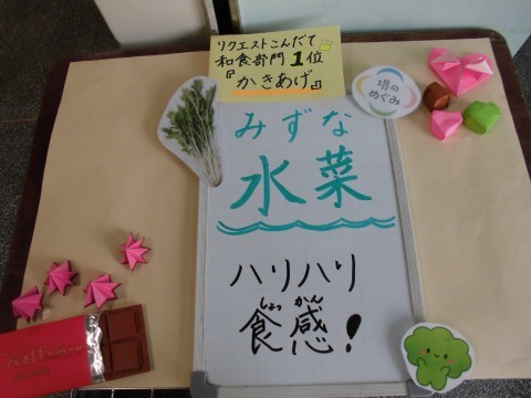 今日の給食では,堺市産の水菜を使って「はりはりうどん」にしました。