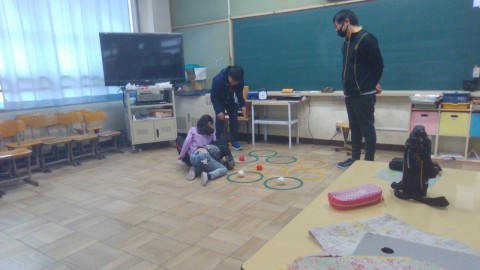 2つ目はボールを使って三目並べをしました。チームで協力して1列そろえたり,相手チームの邪魔をしたりしました。初めての活動でしたが大盛り上がりでした。