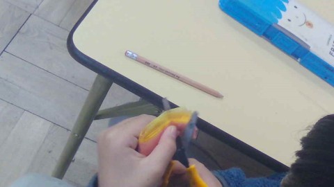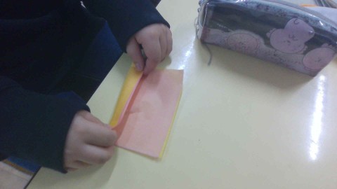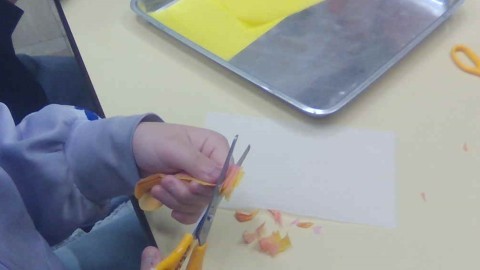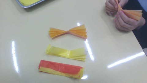 まずは1枚好きな色を選び、もう1枚の黄色の紙と重ねて蛇腹折りにしました。蛇腹に折った紙の端を丸く切るのは少し難しかったかもしれませんが、開くと綺麗な丸みを帯びた花びらになっていました。次に2枚の紙を広げて、黄色の方だけ中心に集めてつぶし、雄しべのようにしました。慣れた子は2個目、3個目と作っていました。細かな作業で、指先のトレーニングにもなりました。ふわふわで優しい色合いの花がたくさんでき、華やかな掲示物になりそうです。