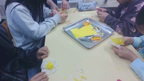 今日の朝の会図工では、掲示物としてお花紙で2種類の花を作りました。
