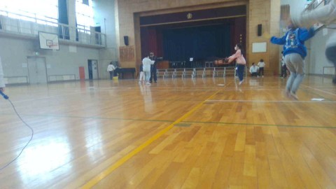 今日の朝の会は体育館ではなわとびとゴム跳び,棒高跳びをしました。