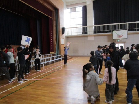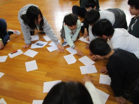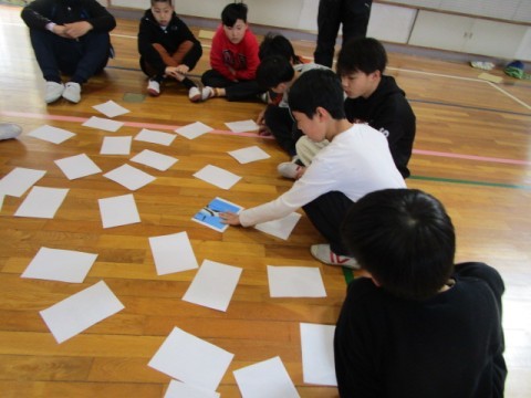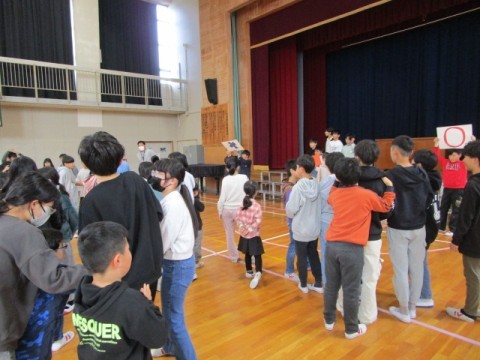 6年生と対面で座ったときはとても緊張した様子でしたが○✕ゲームでは6年生と手をつないでゲームに参加したり,相談したりしていました。