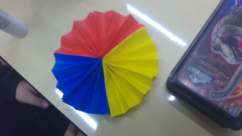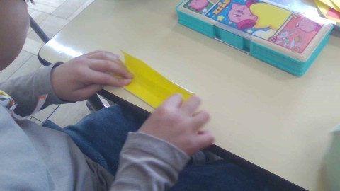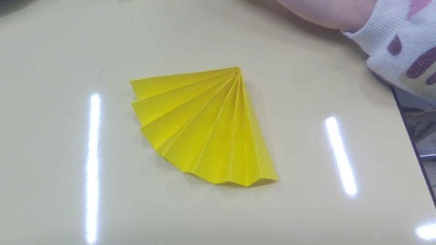 はじめに、以前にもしたことがある蛇腹折りをして、メダルの飾りを作りました。折るのがすっかり上手になっていて、それを扇形にしたものを3つつなげると丸い形になりました。次にメダル本体を丸く切り、「○○がんばったで賞」や「○○できたで賞」といった自分へのメッセージを書きました。頑張ってきた自分へのごほうびになりました。まだあと少しありますが、本当によく頑張りましたね。