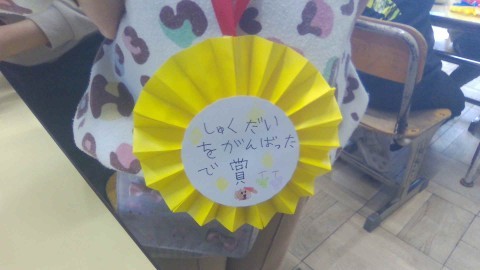 朝の会(図工)で、1年間頑張った自分にむけて「〇〇がんばったで賞」のメダルを作りました。