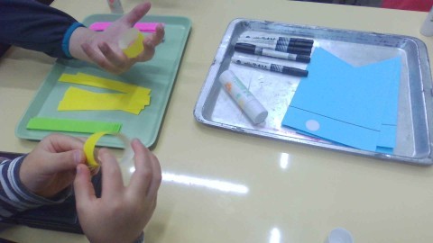 のりをつけるときのポイントを聞いて、4色の色紙を使い、鱗を貼り付けました。