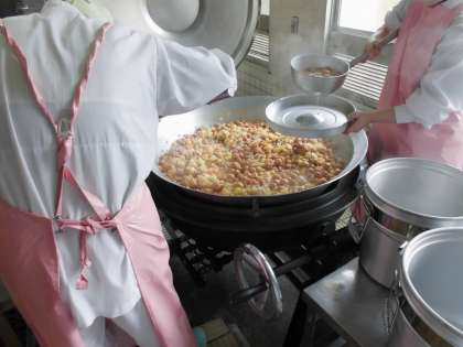 豚肉と野菜のしょうが煮の中に,一口魚菜天が入っています。魚菜天とは,漢字のとおり,魚と野菜の天ぷらです。