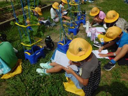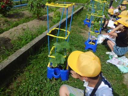 2年3組の子どもたちが自分たちで育てている夏野菜を観察していました。