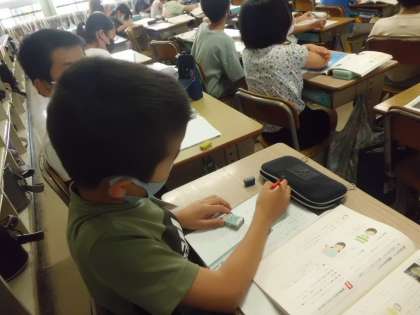 4年2組の国語では、「新聞を読んで感想を伝え合い、単元をふりかえろう。」をめあてに学習を進めていました。掲示されている新聞を再度読み、見つけたよいところを友だちに付箋を用いて伝えていました。また、自分のノートには、単元を振り返っての学びがしっかりと記されていました。