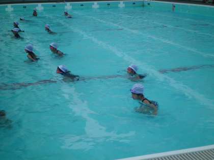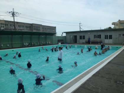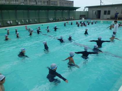 フラミンゴになって水中でバランスを保ったり、カニやワニになってブクブク潜りながら動いたり、今日もいろいろな動物になって水の中で体を十分に動かしました。