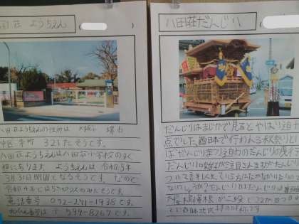 八田荘小学校、八田荘幼稚園、八田荘西小学校、八田荘中学校、だんじり、鈴の宮校園…なじみのあることがらについて調べたようです。