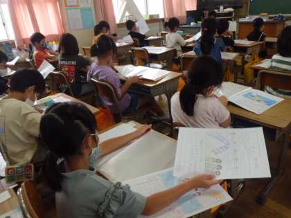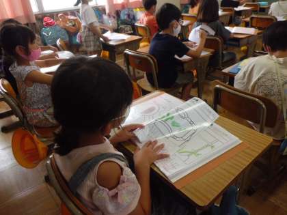 1年2組では、生活科ファイルにワークシートを綴じていました。自分だけの学習の記録が増えていく様子にうれしそうです。