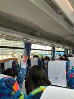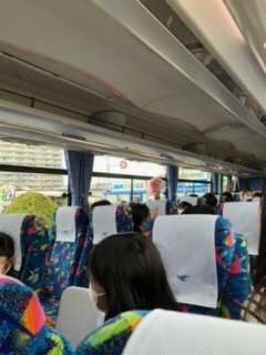 バスレクをしています。実行委員の人が司会をしてくれています。お題カードを回して、エピソードトークをして大盛りです。
