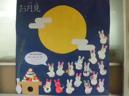 たんぽぽ学級のみんなで、お月見の壁面作品を作り、職員室前に飾ってくれました。