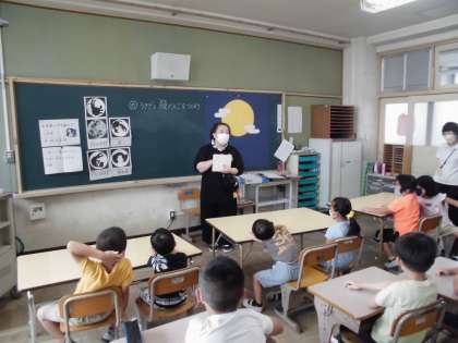 お月見についてお話の後,月の影が何に見えるかクイズをしました。日本ではウサギに見えるといいますが,国や地域によってはカニ,ライオンなどに見えると言われているそうです。