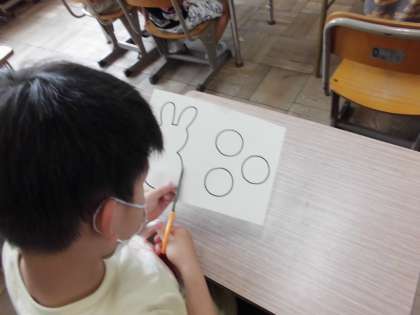 ハサミを細かく動かすことは難しいですが,みんな真剣に取り組んでいました。かわいらしいウサギたちが出来ました。月見団子には好きな味をつけてお供えしました。イチゴ味やチョコ味の他,レインボー味という謎な味もあり,楽しんでいました。