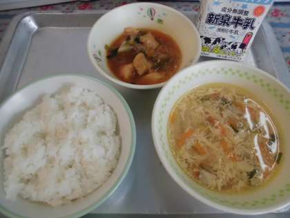 今日の大おかずのスープには,とうもろこしがたっぷり入っていました。