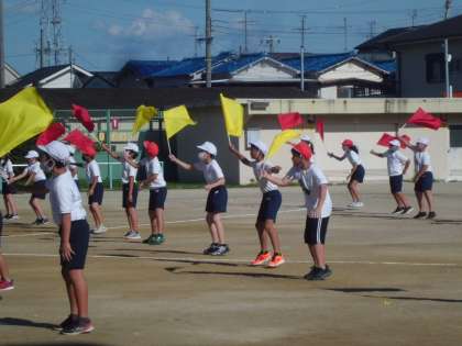6時間目の運動場に、4年生が旗を力強く動かす勇ましい音が響いていました。