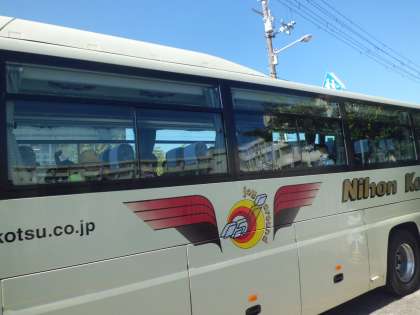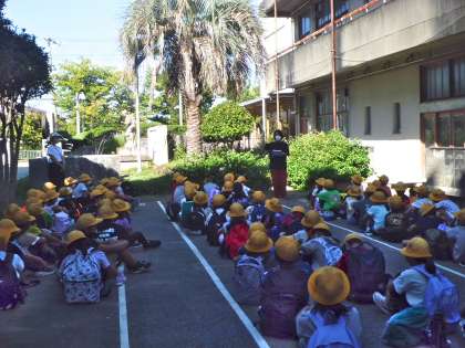 晴天に恵まれ、3年生が校外学習へ出発しました。しおりの予定時刻通りの出発です。
