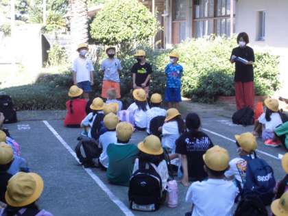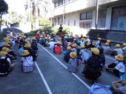 出発の集いでは,実行委員の人が今日のめあての発表や引率の先生の紹介をしてくれました。学びがある校外学習にしましょう。