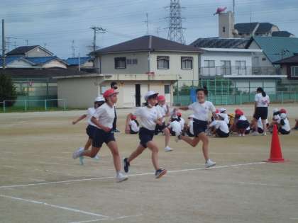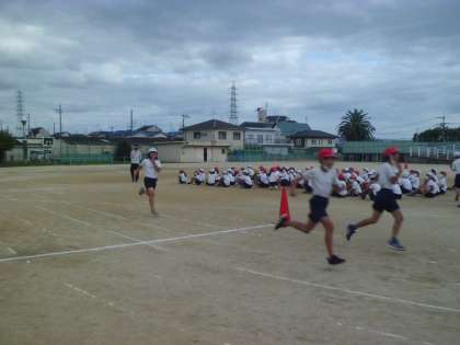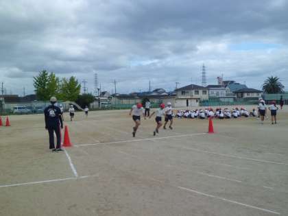 6時間目、5年生が運動場で徒競走のコース確認をしていました。