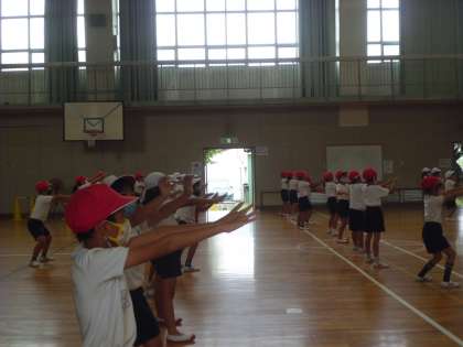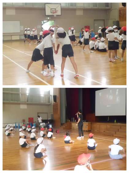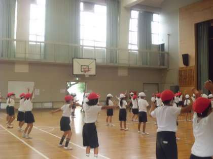2年生が体育館で団体演技の練習に取り組んでいました。ずいぶんと動きをマスターしてきたので、今日は自分たちの演技を録画して見てみました。