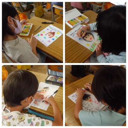 1年生の子どもたちが体育参観の目標をそれぞれ考え、自分の顔の絵と一緒に画用紙に表していました。