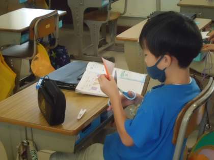 2年1組の算数では、三角形について学習していました。正方形の折り紙を斜め半分に切り、三角形の特徴に着目です。